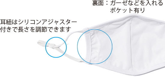 ●耳紐はシリコンアジャスター付きで長さ調節可能。耳が痛くならない柔らか素材。